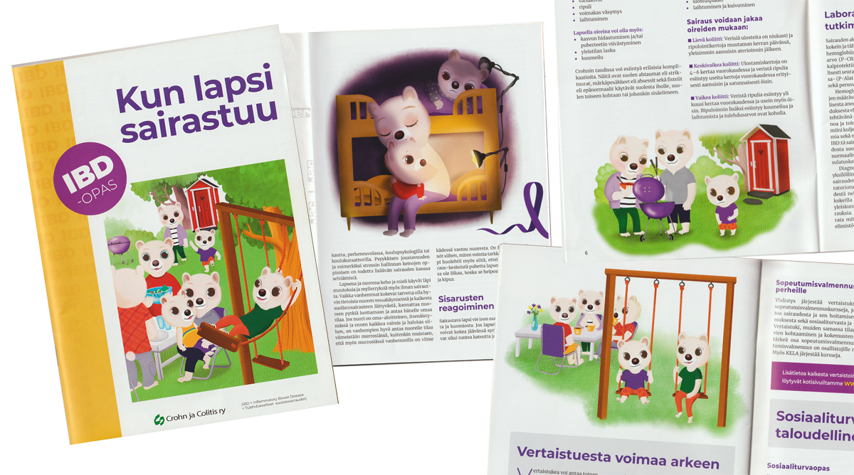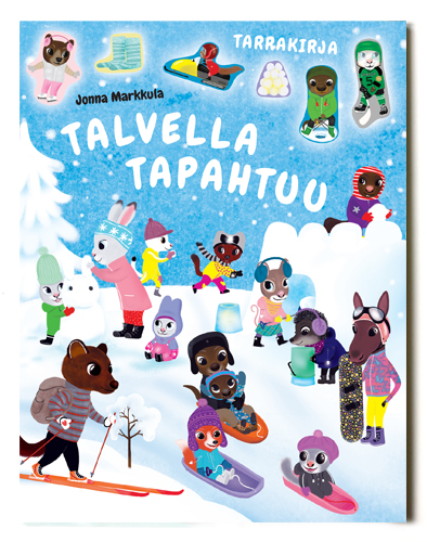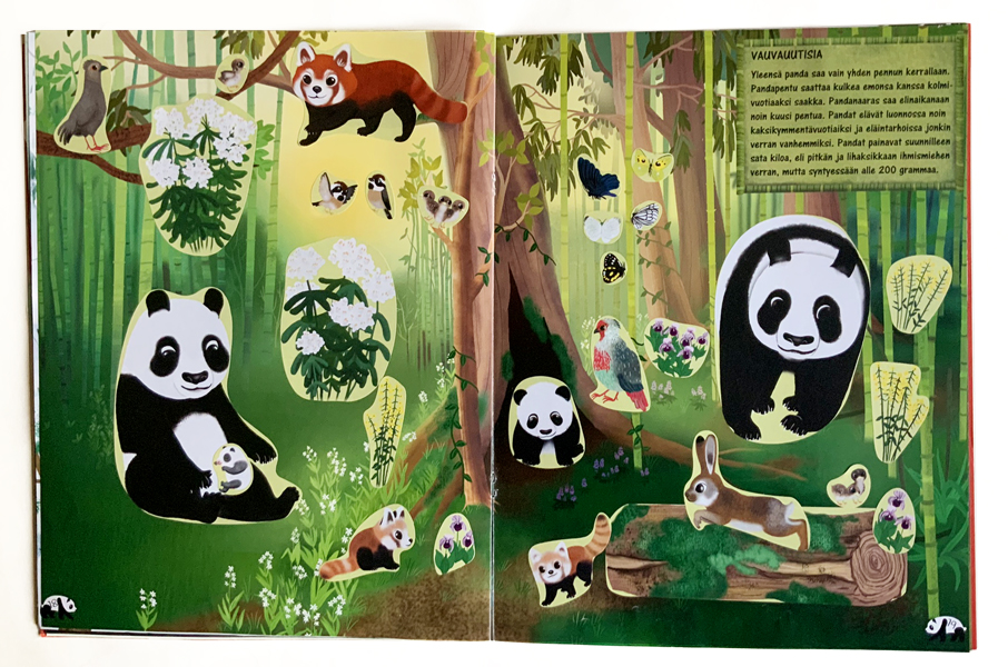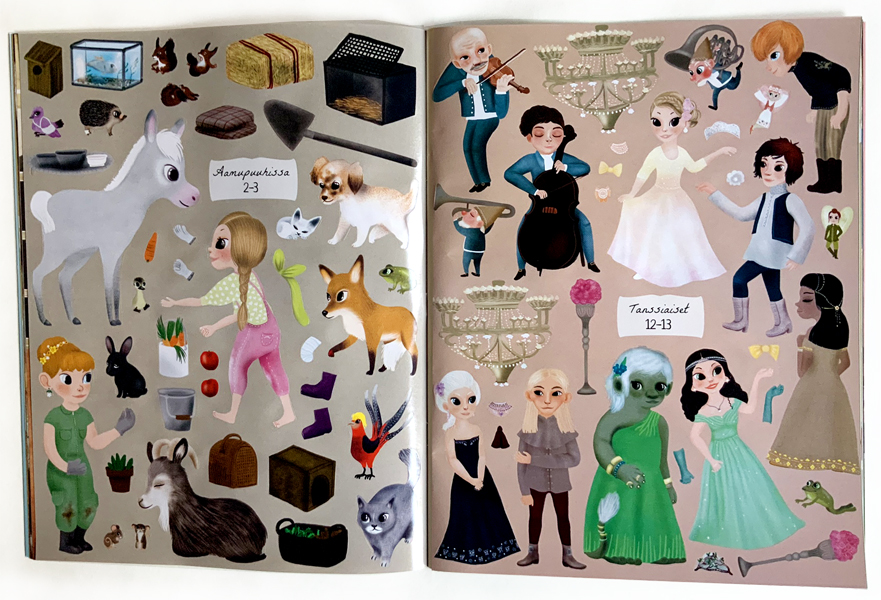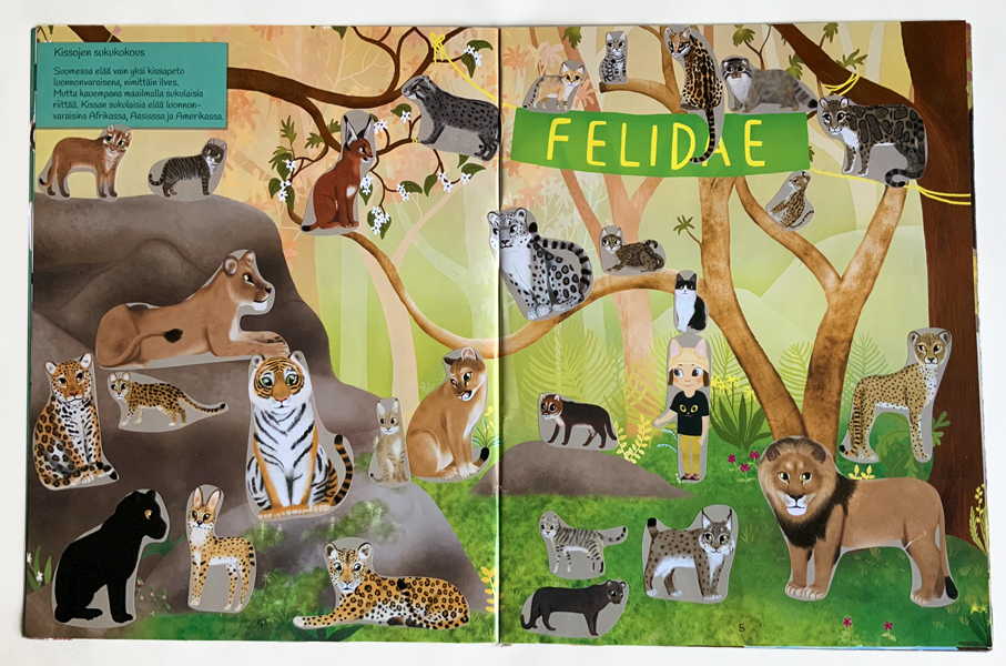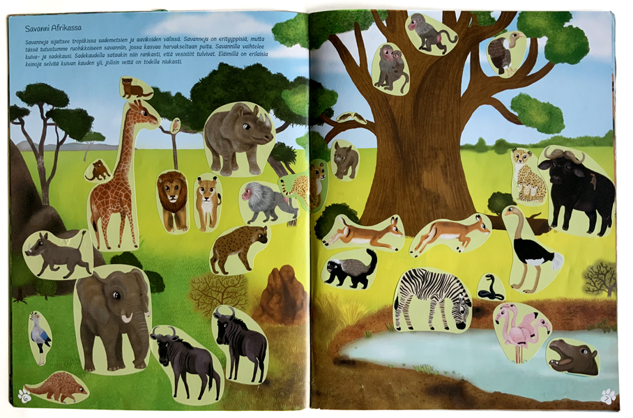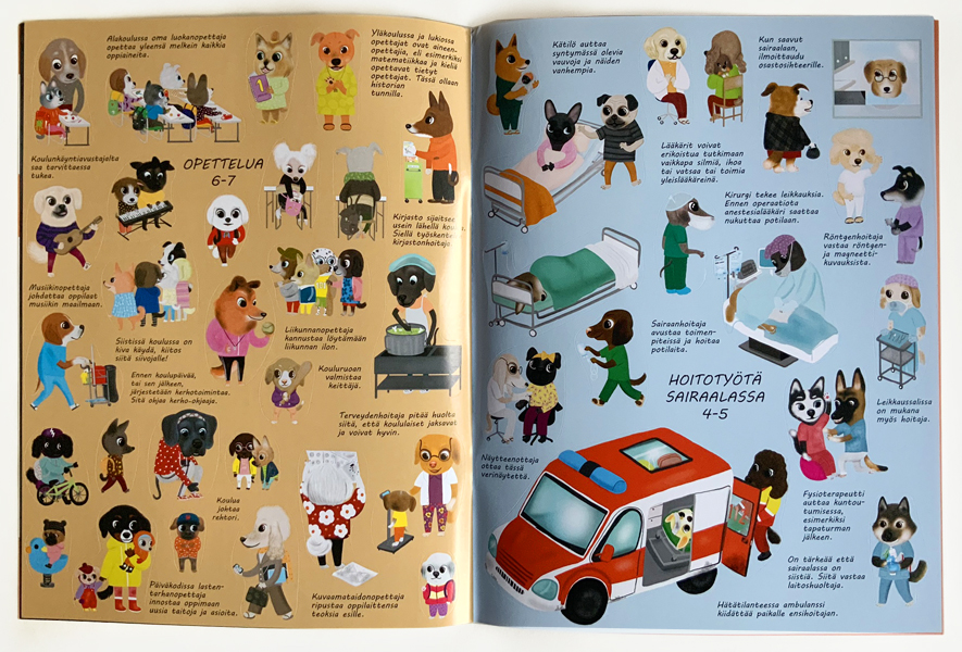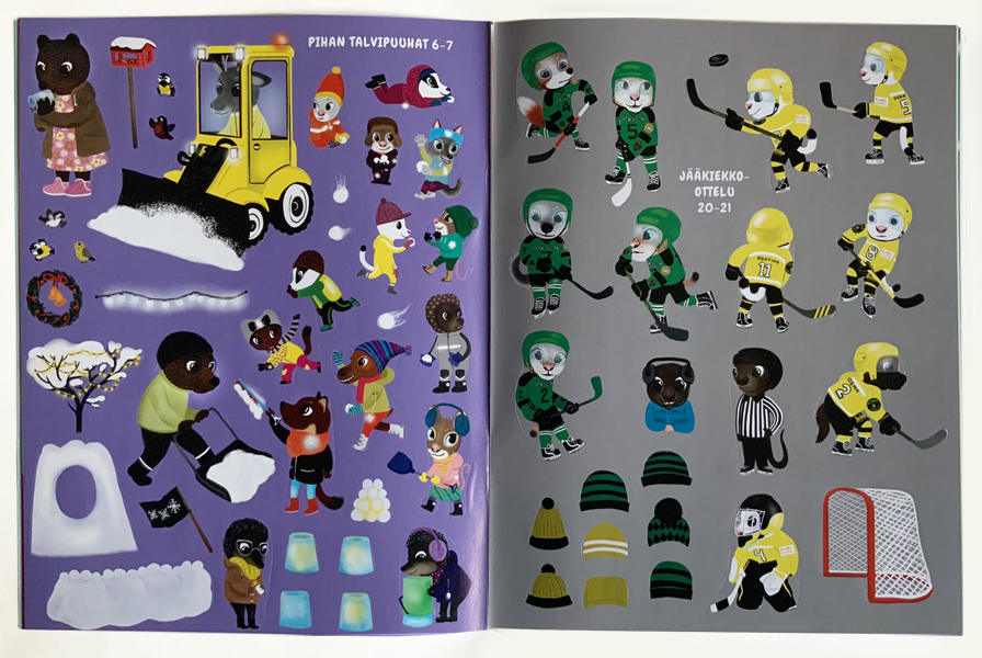 Olen tehnyt suloisia eläinhahmoja satukirjoihin ja tutun oloisia tyyppejä oppaisiin ja esitteisiin. Tarrakirjat pursuavat yksityiskohtia, kun taas järjestöille olen kiteyttänyt tietoa yksinkertaisiin infokuvituksiin.