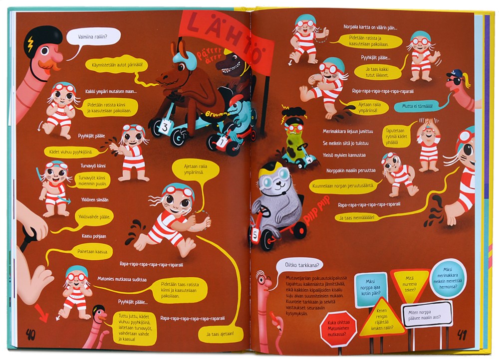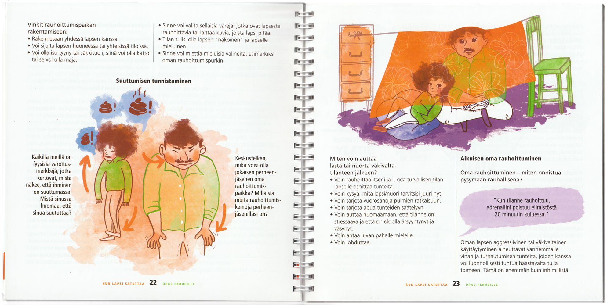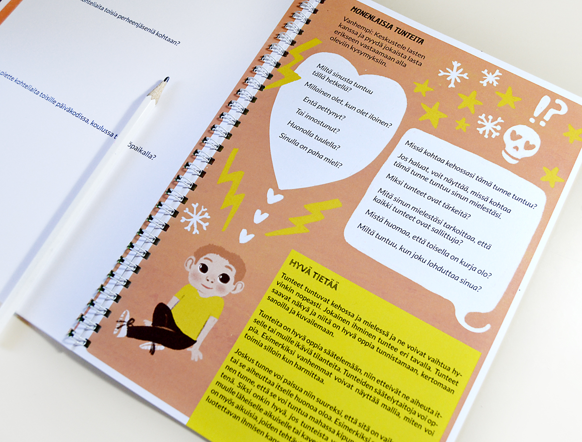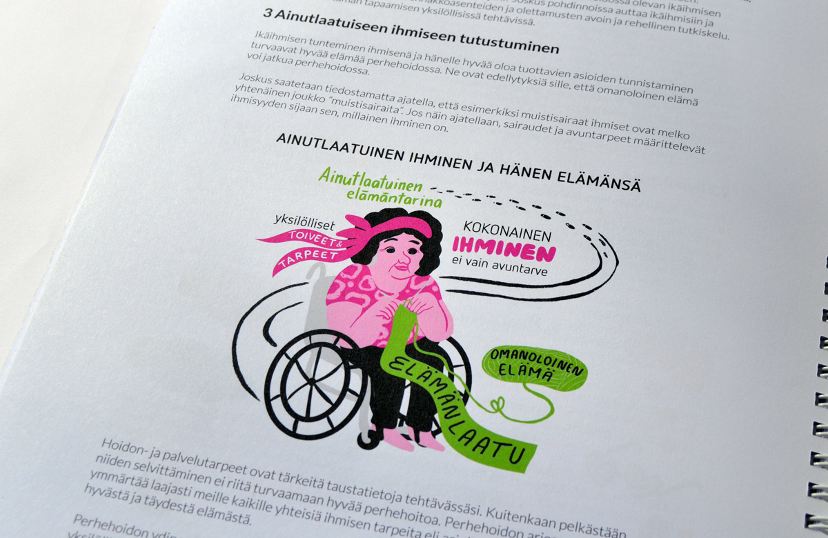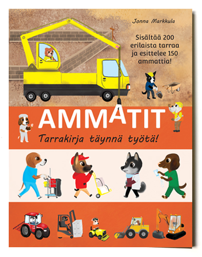 Olen tehnyt suloisia eläinhahmoja satukirjoihin ja tutun oloisia tyyppejä oppaisiin ja esitteisiin. Tarrakirjat pursuavat yksityiskohtia, kun taas järjestöille olen kiteyttänyt tietoa yksinkertaisiin infokuvituksiin.