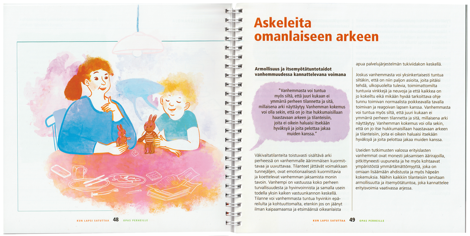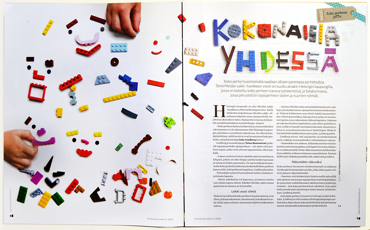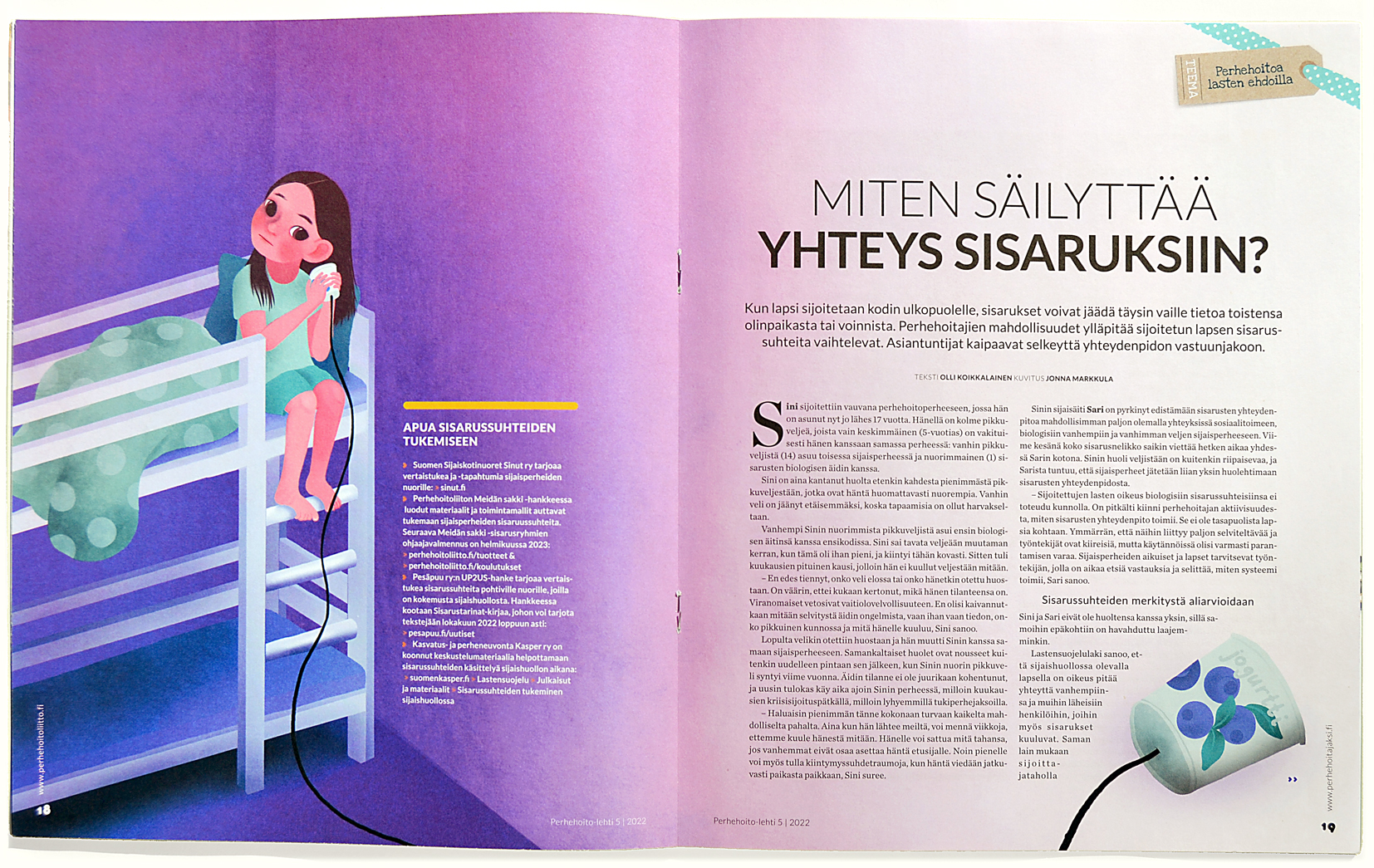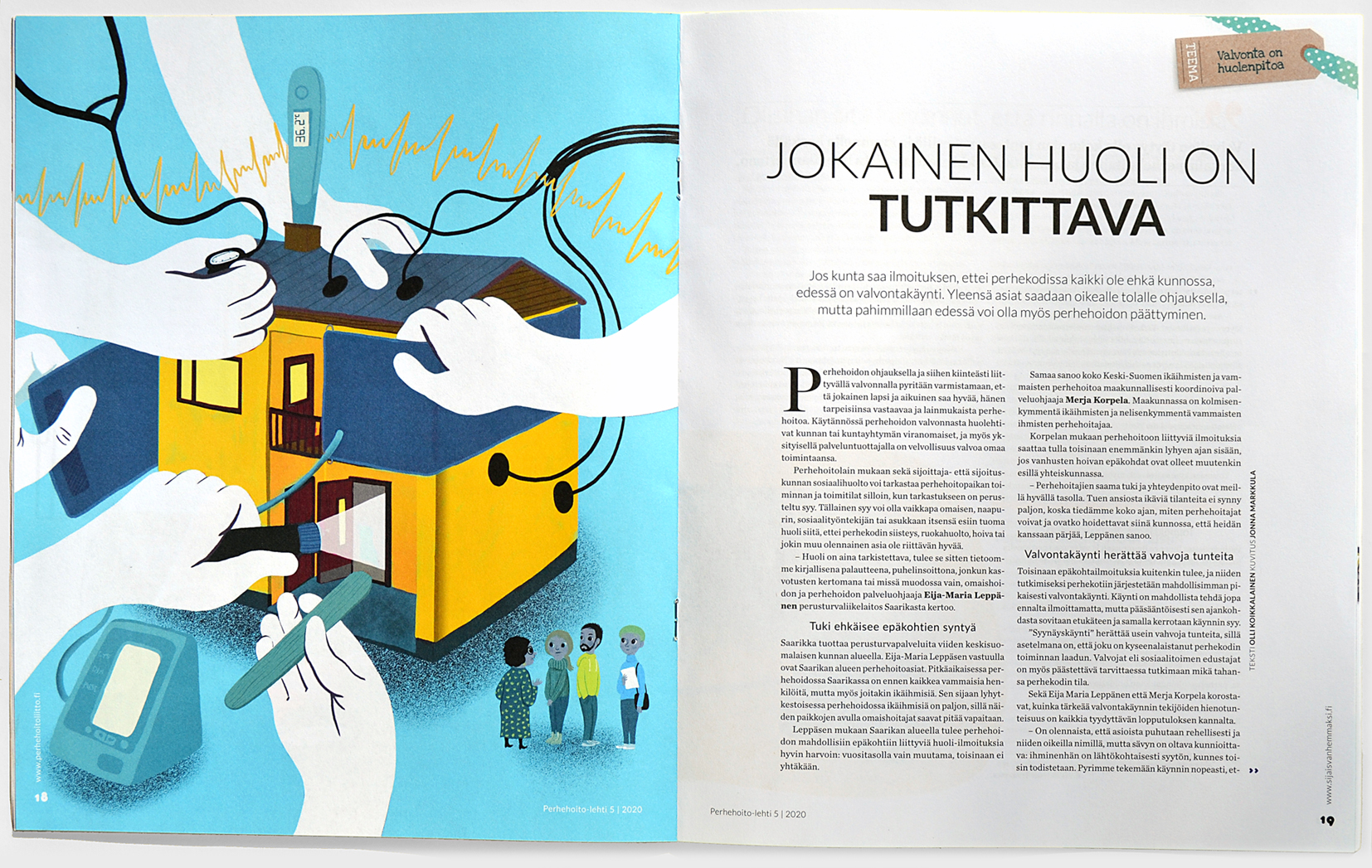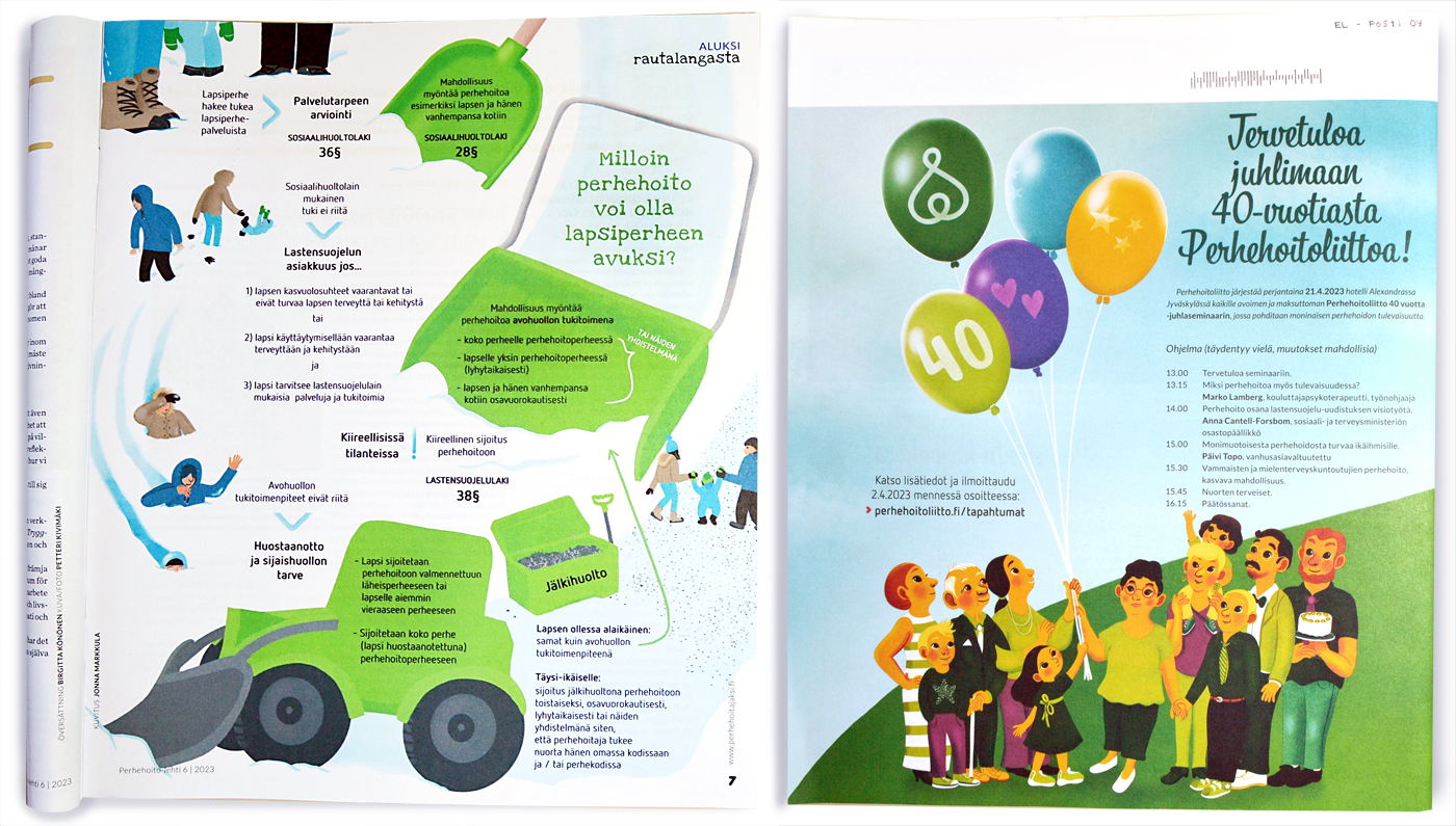 Olen kuvittanut Perhehoito -lehteä vuodesta 2010. Lehtikuvituksia teen eri tyyleillä ja tekniikoilla.