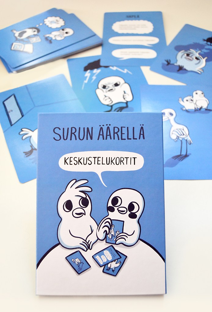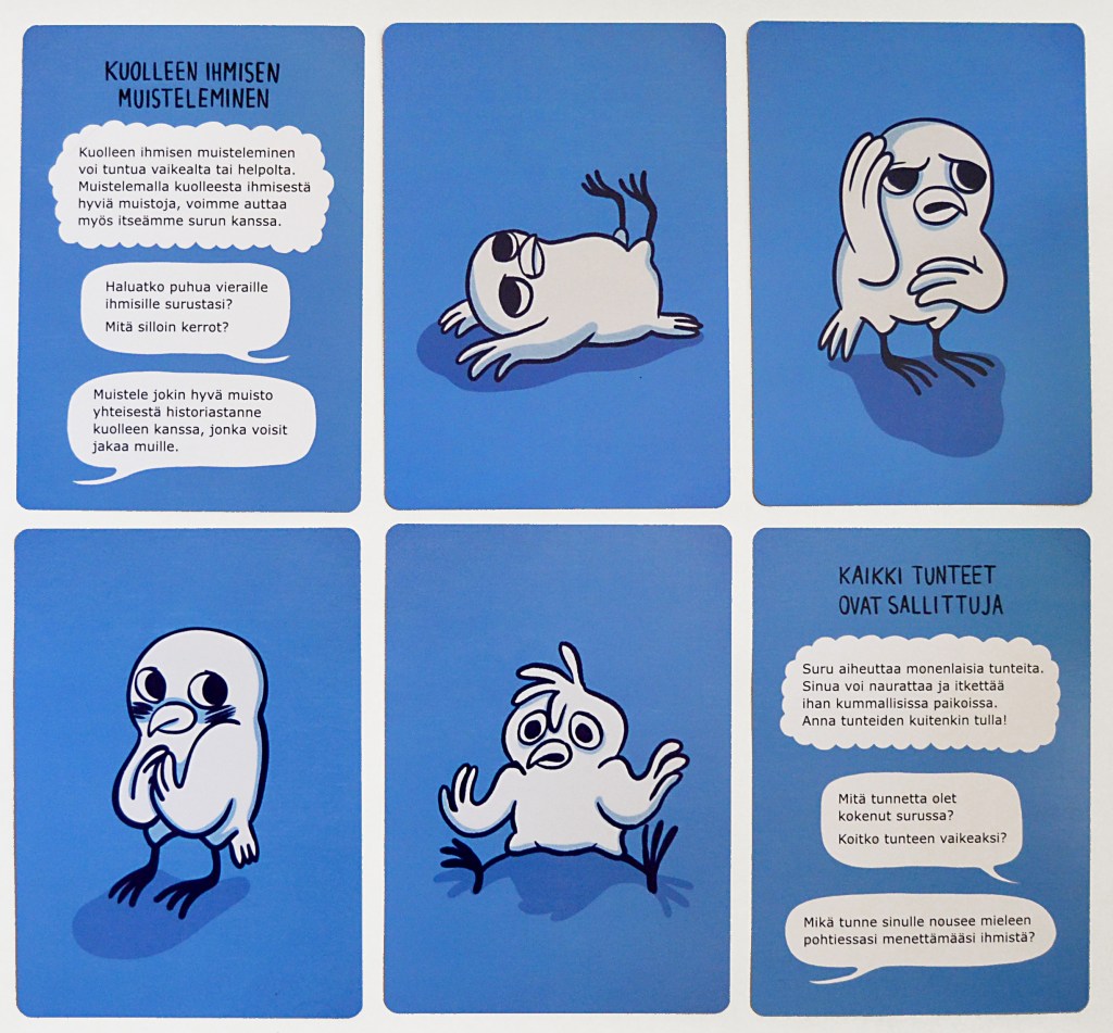 Keskustelukorttien avulla voidaan käsitellä surua ja läheisen menetystä. Kortit on suunniteltu erityistä tukea tarvitsevien ihmisten tarpeisiin, mutta niitä voidaan käyttää kaikkien surua kohdanneiden kanssa. Kehitysvammaisten palvelusäätiö 2023.