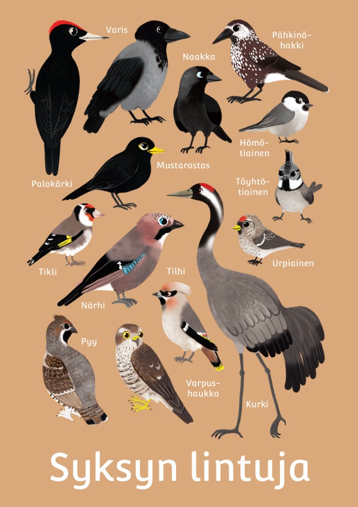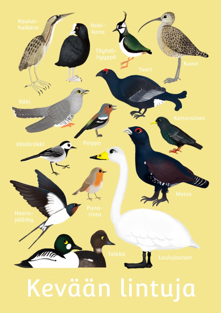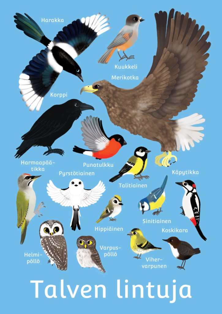 Kevään lintuja 30 kpl, Kesän lintuja 5 kpl, Syksyn lintuja 15 kpl, Talven lintuja 5 kpl