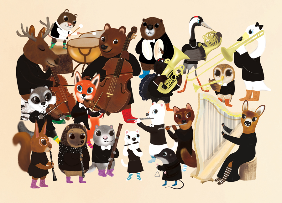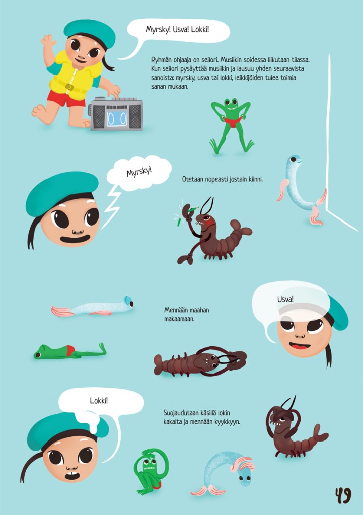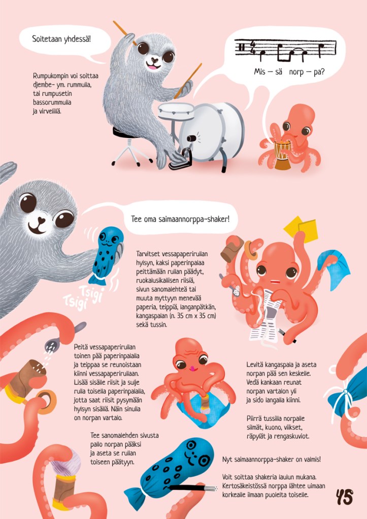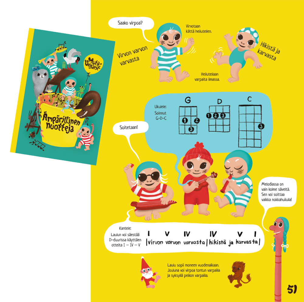 Lastenmusiikkiorkesteri Mutaveijareiden nuottikirjassa on nuottien lisäksi leikkiohjeita. Olen tehnyt kirjaan kuvituksen lisäksi taiton.
