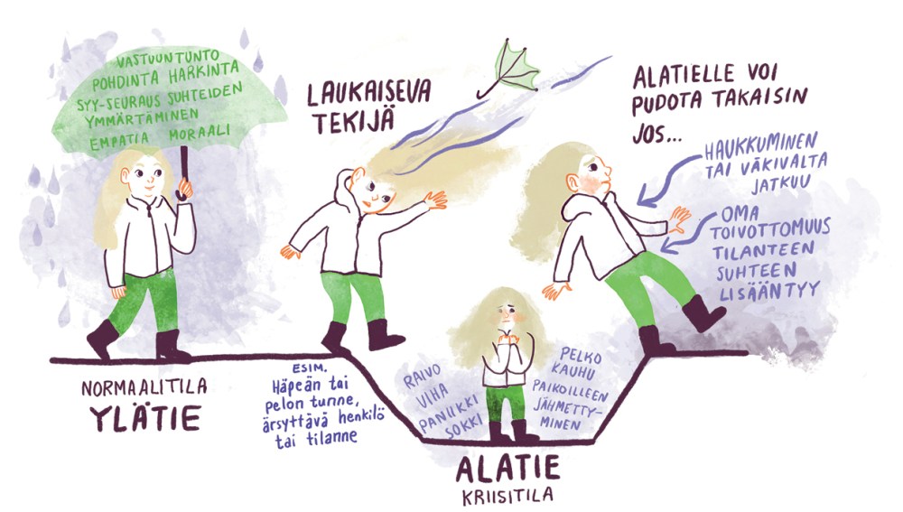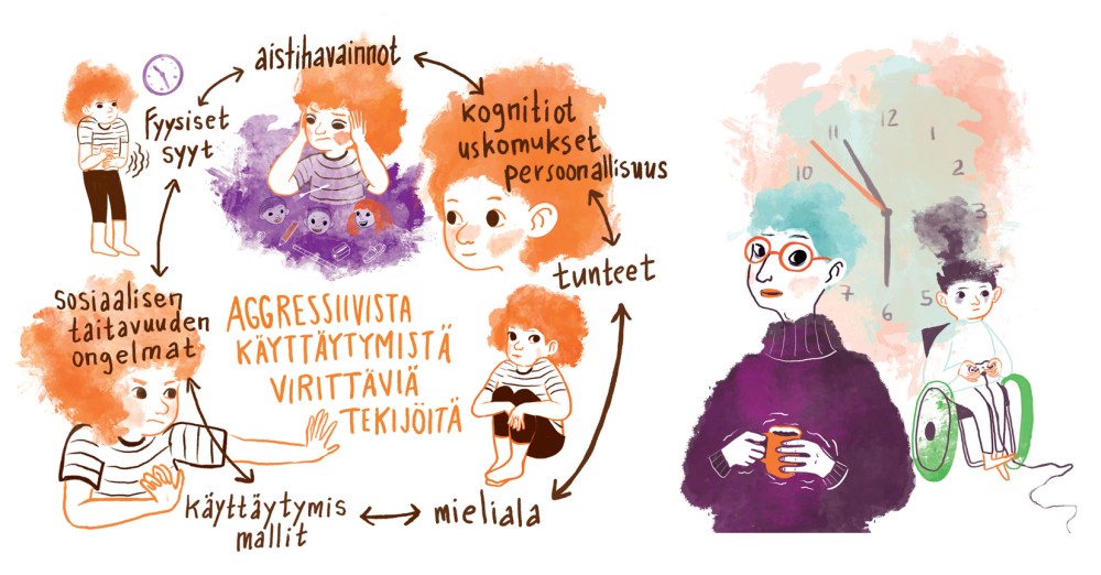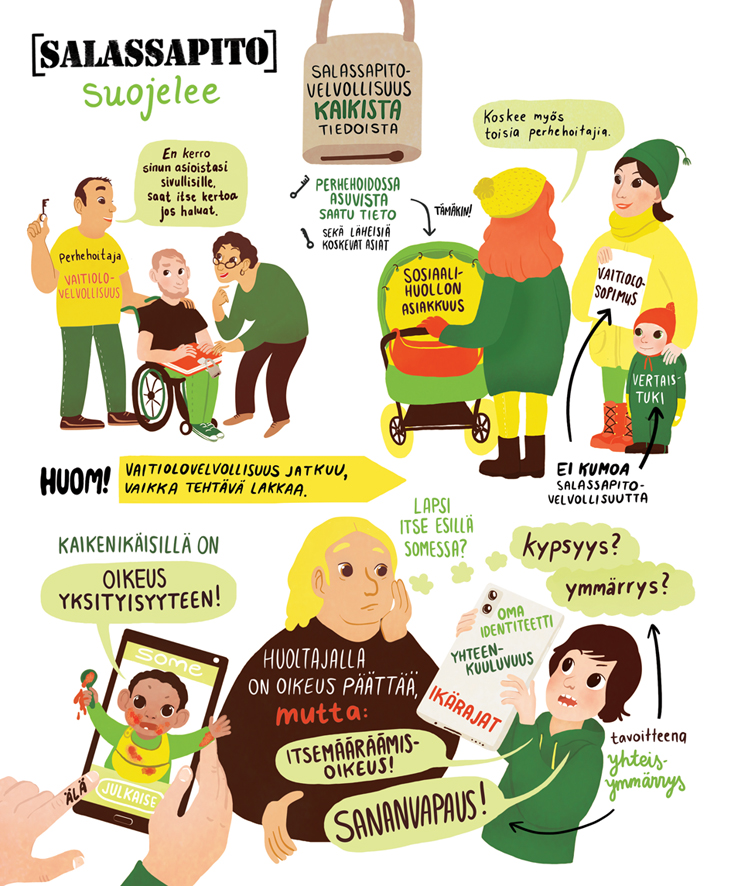 Kehitysvammaisten palvelusäätiön oppaan kuvituskuvia ja infokuvia.