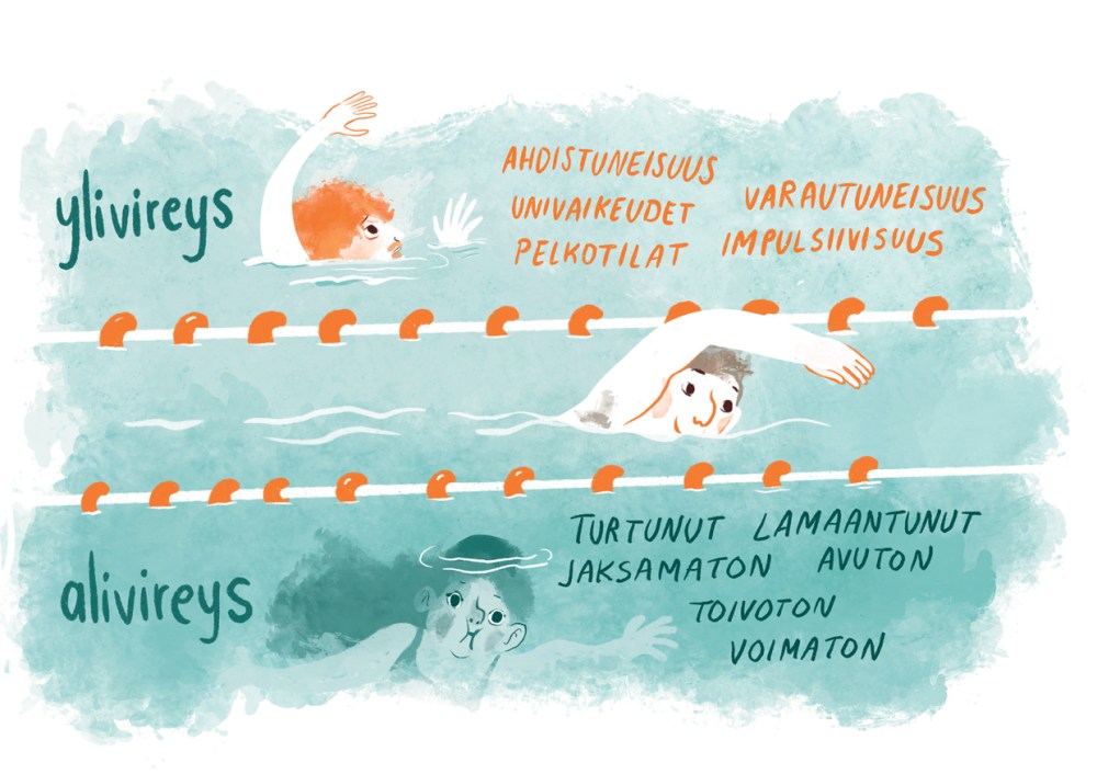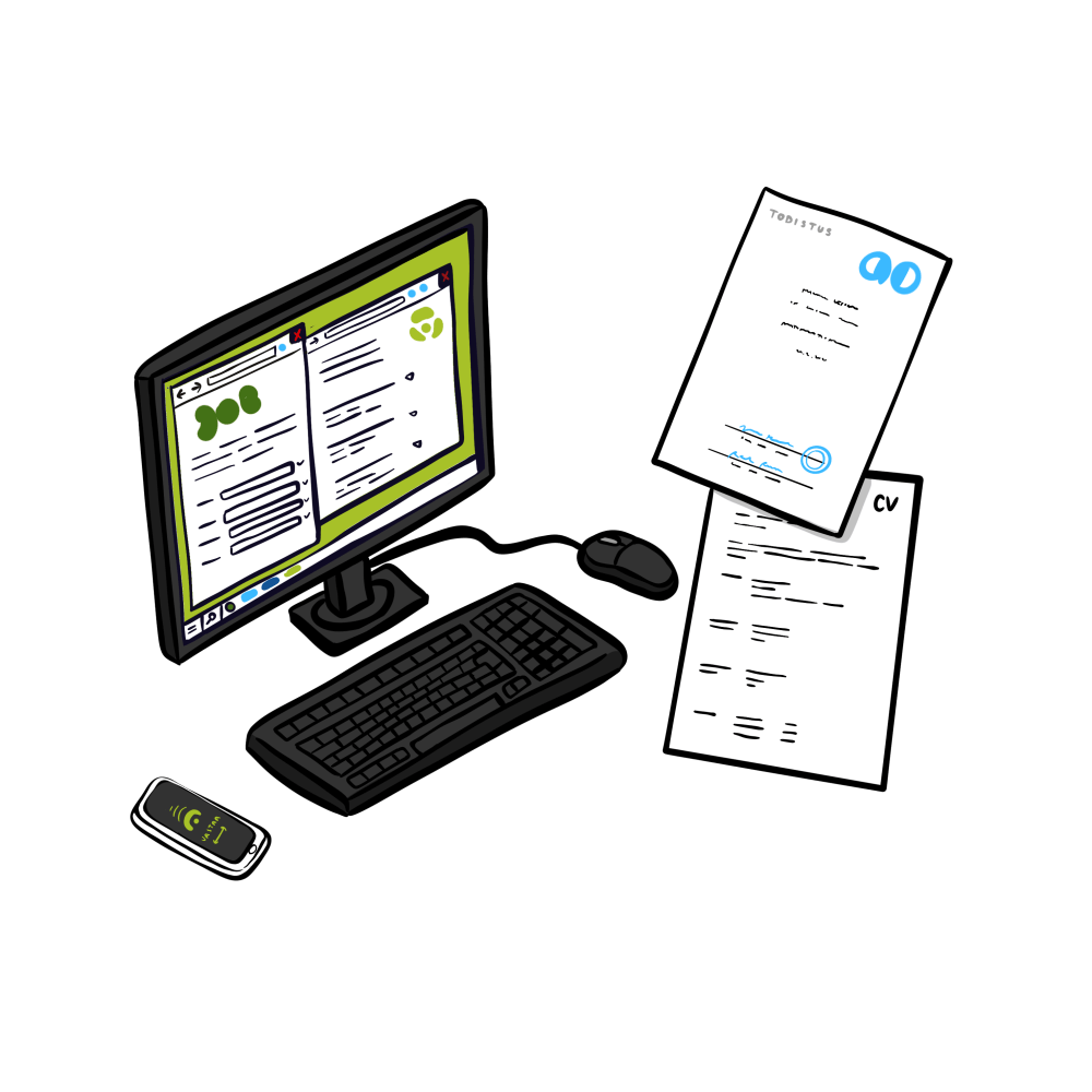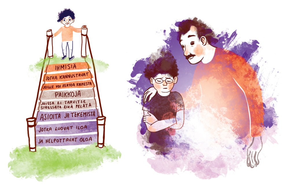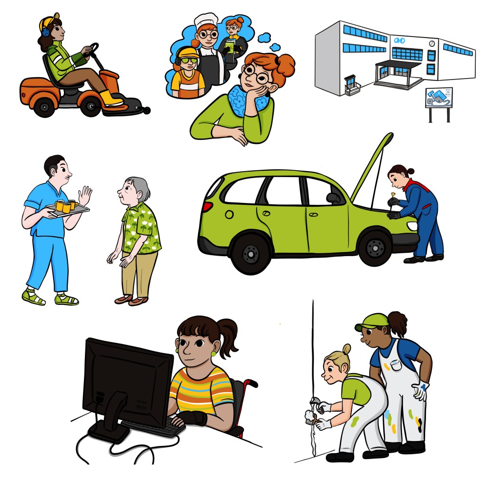 Kehitysvammaisten palvelusäätiön hankkeelle tehtyjä kuvituksia erityistä tukea tarvitsevien maahanmuuttajataustaisten nuorten työllistymisestä ja opiskelusta.