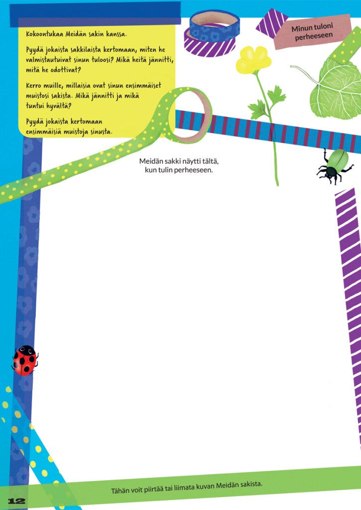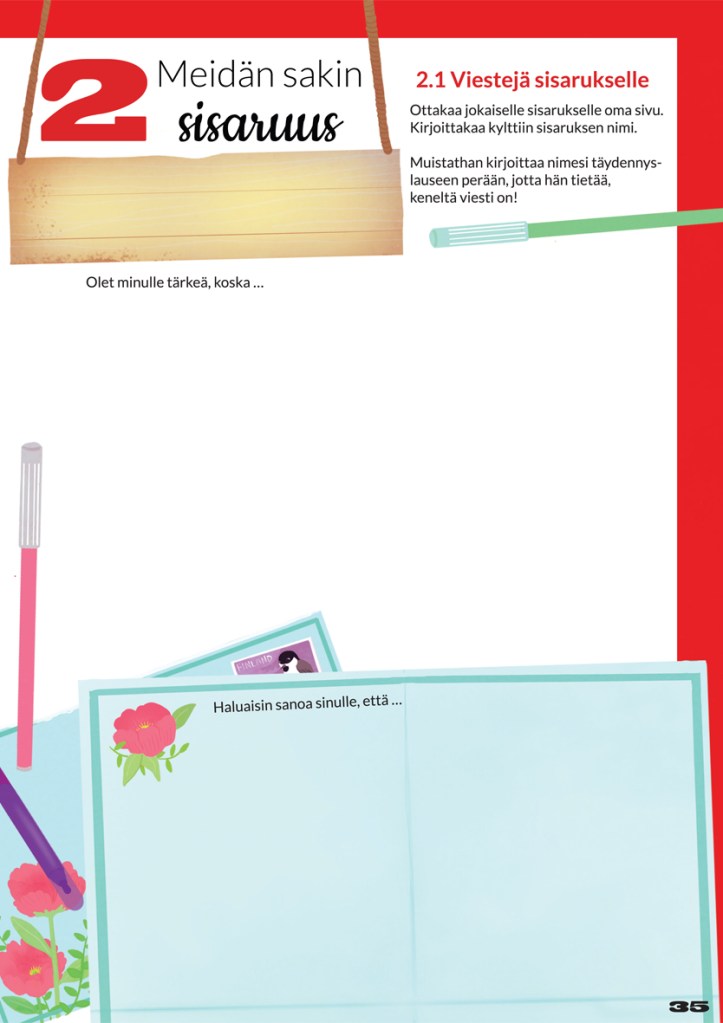 Sijaislasten perheille suunnatun tehtäväkirjan sivuja.